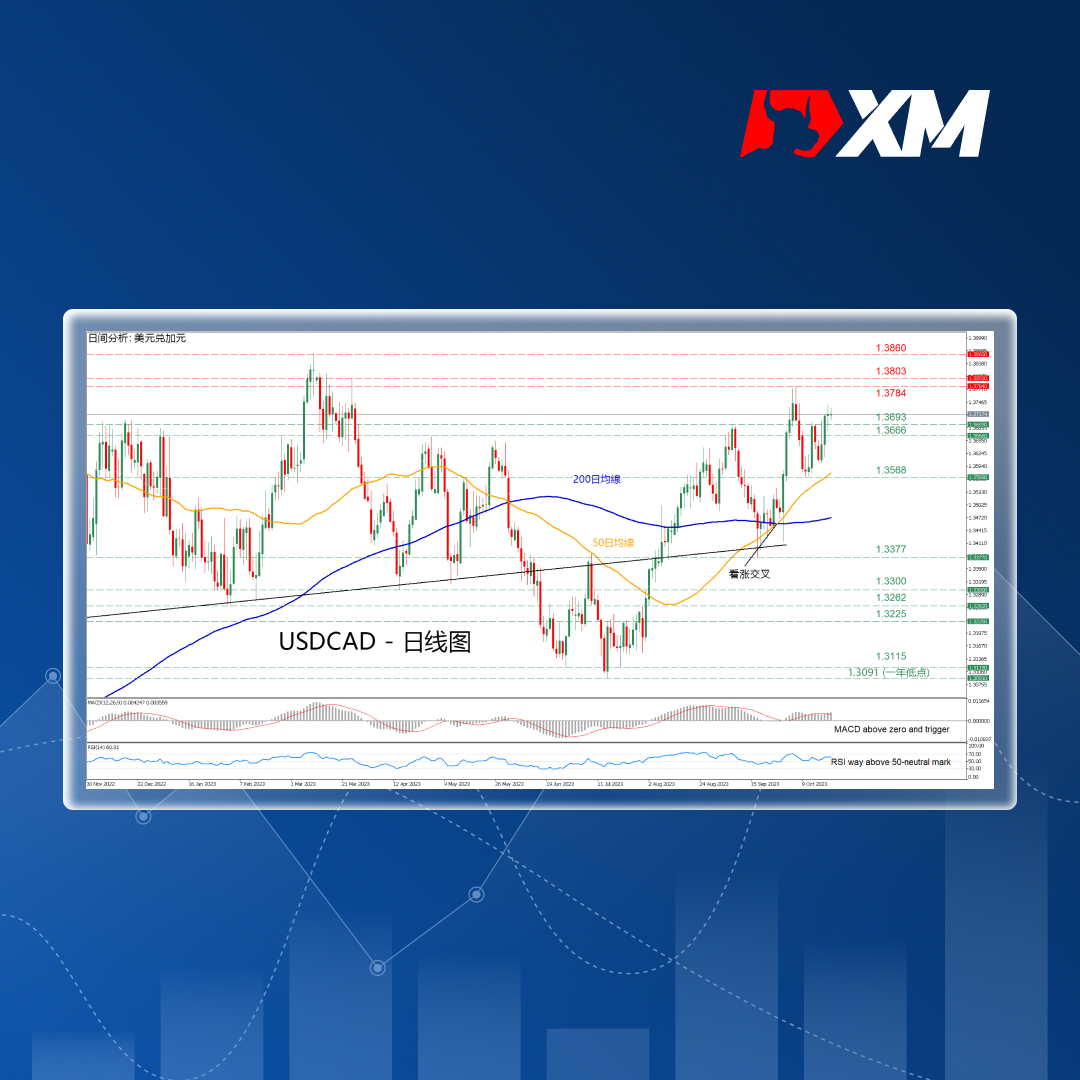 USDCAD自9月底以来一直稳步上涨,并于10月5日创六个月新高1.3784。尽管该货币对下行回调,但随后迅速企稳并挽回部分损失,而相对强弱指数(RSI)和异同移动平均线(MACD)指标均维持在看涨区间并支持反弹趋势。