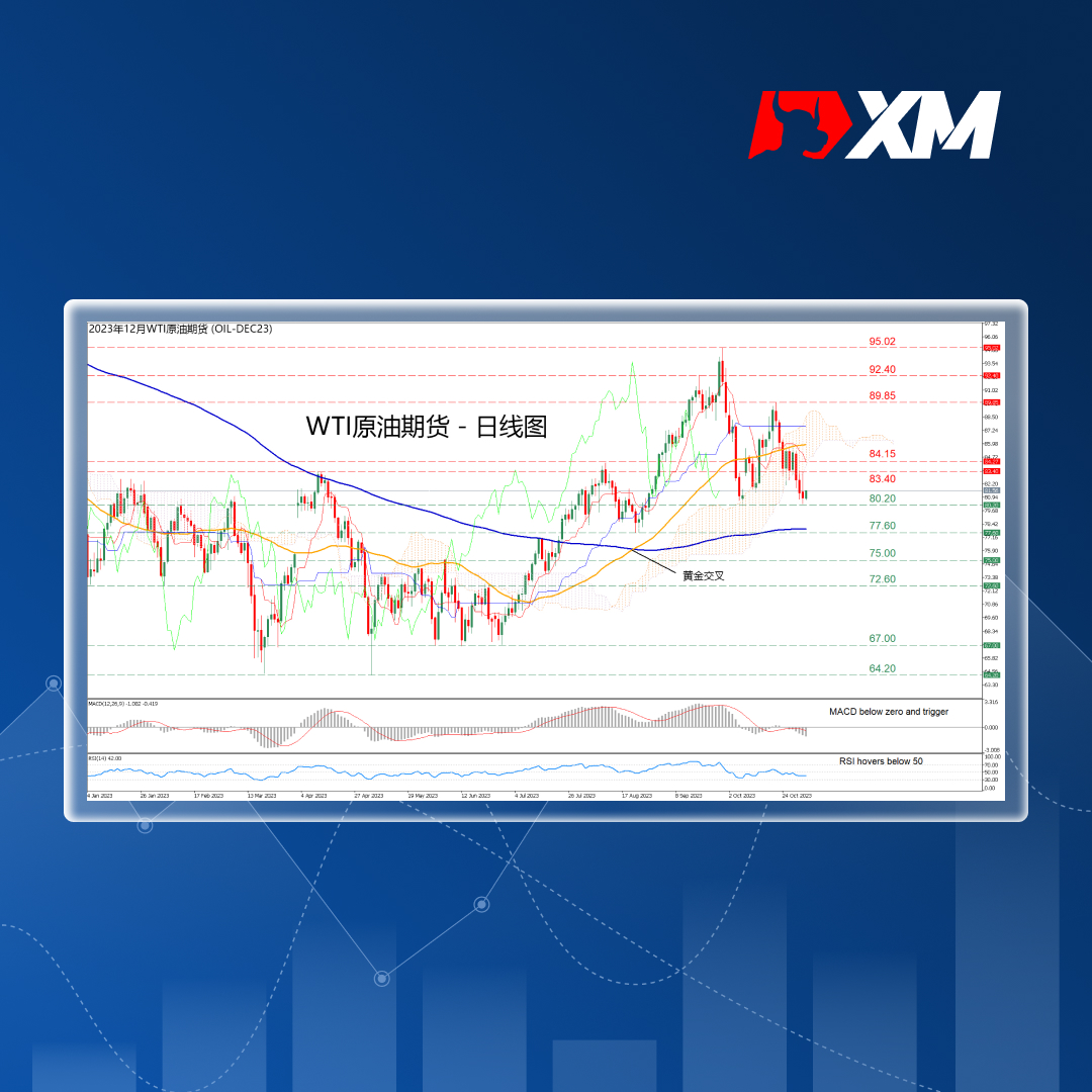 WTI原油期货(12月交割)触及10月高点89.85后持续回落。短期内价格无法突破50日移动平均线(SMA),导致跌势加速并跌破一目均衡图。