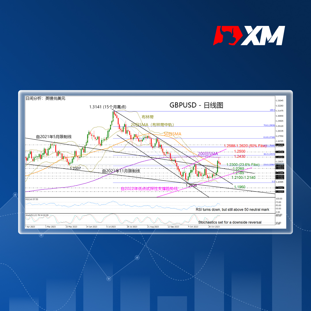 GBPUSD未有足够动力延续周五看涨势头并突破200日移动平均线(SMA),周一收盘在1.2300区间内小幅下跌。