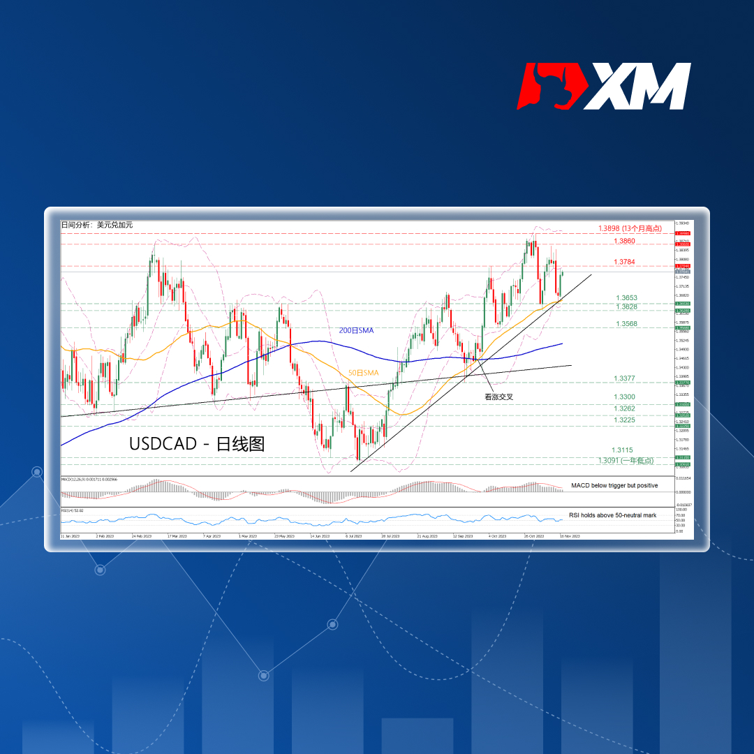 USDCAD自7月以来一直稳步上涨,在11月2日创下峰值1.3898,也是近13个月来的最高点。过后,该货币对两次出现疲软,但两次下跌均在上升的50日移动平均线(SMA)获得支撑。