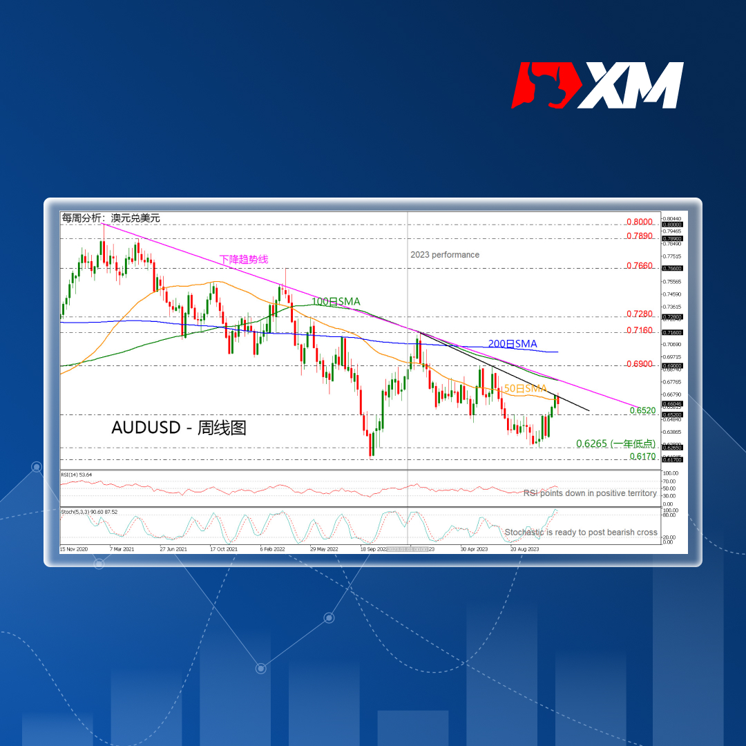 随着2023年接近尾声,AUDUSD继续维持自2021年2月开始的下跌走势。目前,该货币对正在测试自1月以来绘制的下降趋势线及50周移动平均线(SMA)。