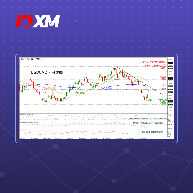 2023年底USDCAD自前期低点1.3175反弹后持续上涨,目前已触及位于1.3373的20日移动平均线(SMA),但仍维持在下降趋势线下方。