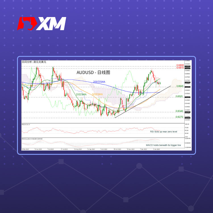 过去五日,前期低点0.6645在一直提供支撑,若汇价反转下行,一旦跌破位于0.6615的50日移动平均线(SMA)可能再现新的看跌趋势,继而推动汇价跌至位于0.6580的200日移动平均线(SMA),即与中期上升趋势线重叠之处。继续下行,看跌走势或将加剧,届时前期低点0.6520可能立即提供支撑。