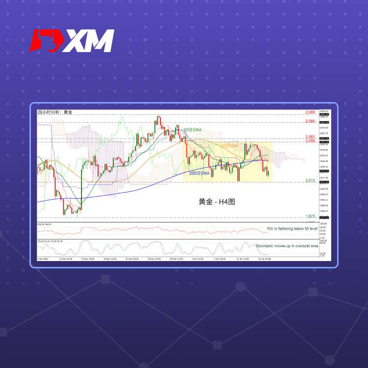 过去两天内,黄金价格于在4小时交易图表中一直呈下行趋势,保持在一目均衡图和短期移动平均线下方。交易员需观察黄金价格能否跌破前期低点2,013这个关键水平,该水平几次提供强劲支撑。因此,一旦跌破此处,或会出现强劲下跌趋势。