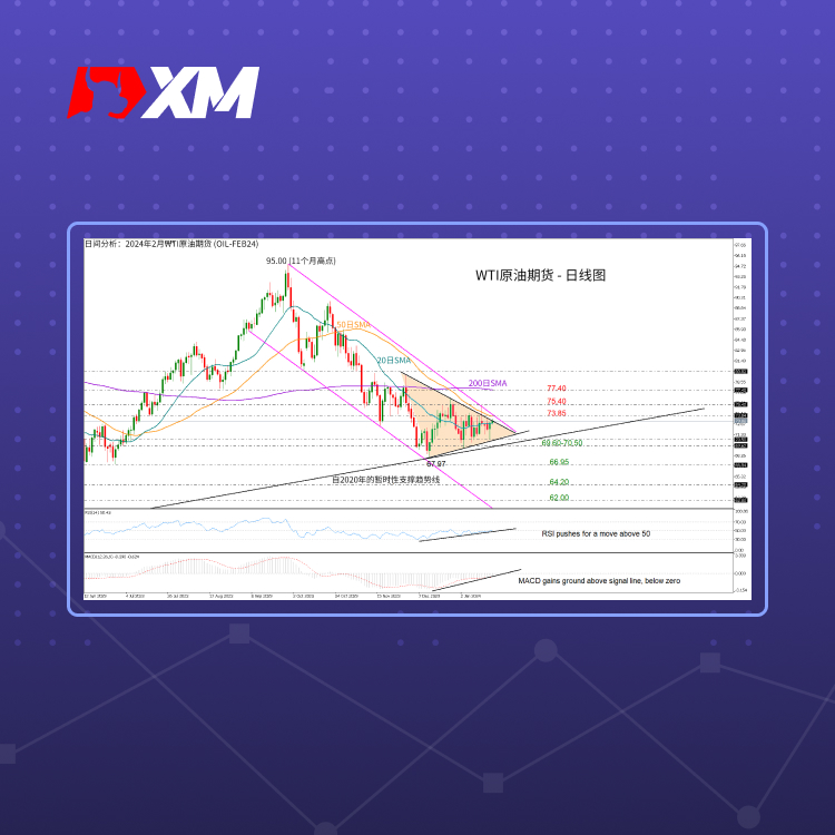 若价格下跌,或会重新测试三角形的下轨70.50和位于69.60的2020年低点暂时性上升趋势线。若未能在该处反弹则可能会强劲下跌,测试5月 – 6月底部66.95。进一步下跌,2023年低点64.20和62.00水平或相继成为支撑。