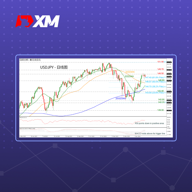 USDJPY自前期低点140.20反弹后,过去五日里一直尝试突破前期高点148.50。目前该货币对仍维持在斐波那契回调线61.8%位置的价格147.40(对应图中151.90-140.20)上方,已高于简单移动平均线(SMA)。