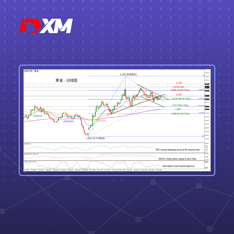 若收盘价强劲突破前期高点2,035及短期看跌通道,可能提振买盘情绪,继而推高价格升至前期高点2,065,即与10月-12月上涨的斐波那契回调线23.6%位置的价格重叠之处。继续上行,价格或将再次测试去年12月强劲阻力区间2,079-2,087。若成功突破此区间范围,则价格有望触及2,100心理关口。